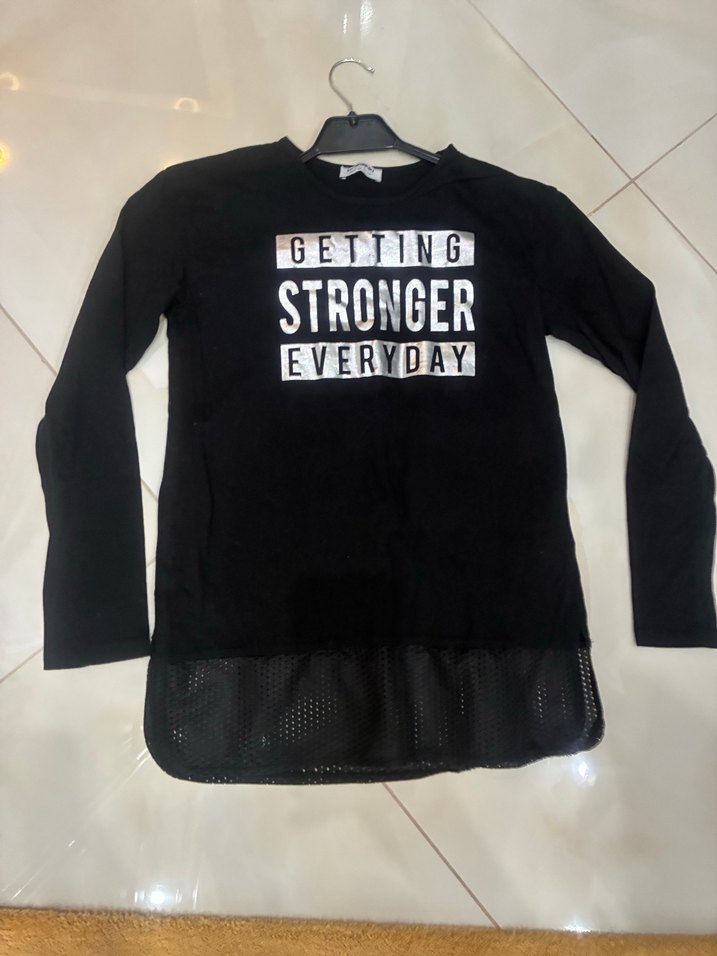 Kız çocuklar için dar kesim siyah uzun kollu tişört, bisiklet yaka ve "GETTING STRONGER EVERYDAY" baskılıdır. Velcro detay ve file etek ucu bulunur.