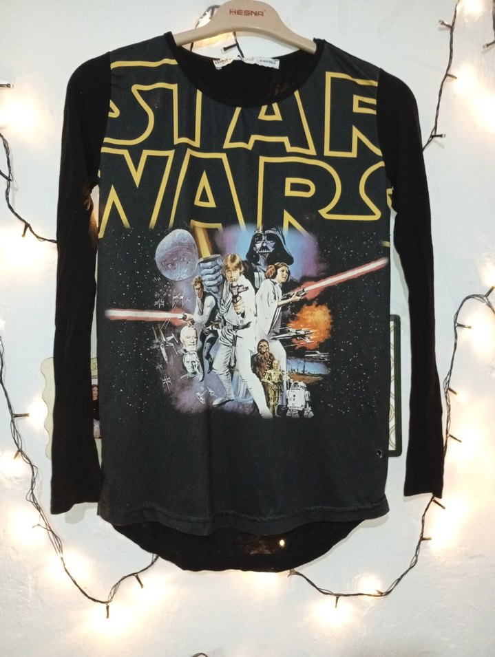 Kız çocukları için siyah, uzun kollu, bol kesim ve yuvarlak yakalı tişört. Star Wars baskısı ve tokalı detaylar bulunur. "MARS" yazısı mevcuttur.