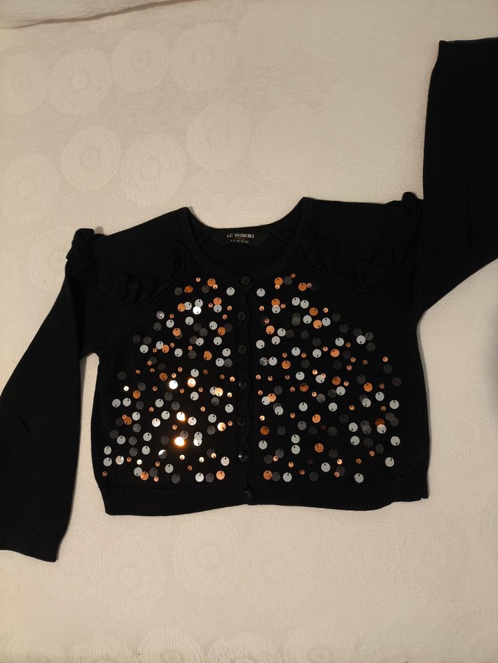 Siyah renkli, uzun kollu, düğmeli ve bol kesim kız çocuk bolero. Üzerinde parlak payet baskılı desenler bulunur, gotik tarzda şık bir parça. ✨