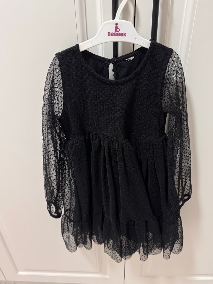 Siyah renkli, uzun kollu, fırfırlı ve bol kesim kız çocuk elbisesi. Yuvarlak yakalı ve yumuşak sentetik kumaştan yapılmıştır.