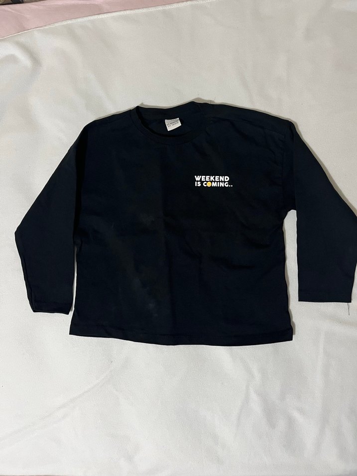 Siyah renkli, uzun kollu kız çocuk sweatshirtü, yuvarlak yaka ve bol kesimlidir. "WEEKEND IS COMING" baskılıdır. Yumuşak ve sıcak kumaştan üretilmiştir.