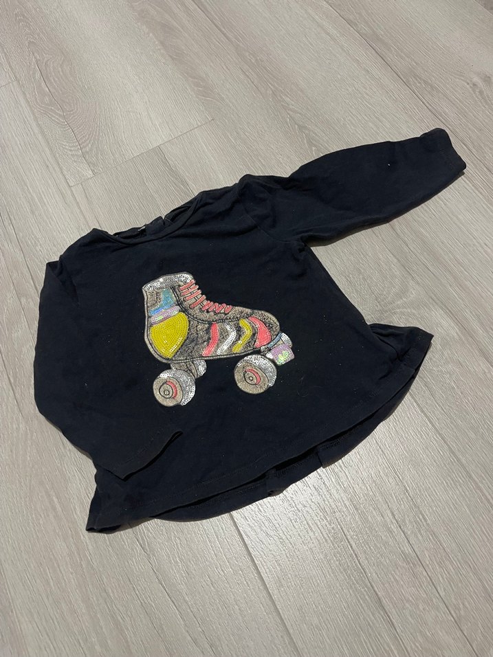 Siyah renkli kız çocuk uzun kollu tişört, önünde renkli paten baskısı bulunur. Rahat kesim, yuvarlak yaka ve cırt cırt detaylı, yumuşak ve sıcak kumaştan üretilmiştir. Bir kaç defa kullanıldı. Deposu yoktur temiz üründür. Tüm detaylarını görselde paylaştım. Mimik ellere faydalı olması için uyguna satıyorum. Toplu kıyafet alımlarında indirim yapıyorum.☺️