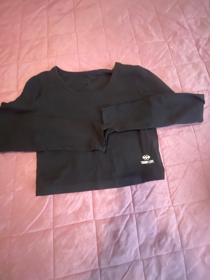 Kız çocukları için siyah, uzun kollu, dar kesim tişört, yuvarlak yakalı ve yumuşak sentetik kumaştan, trend sokak stili sunar.