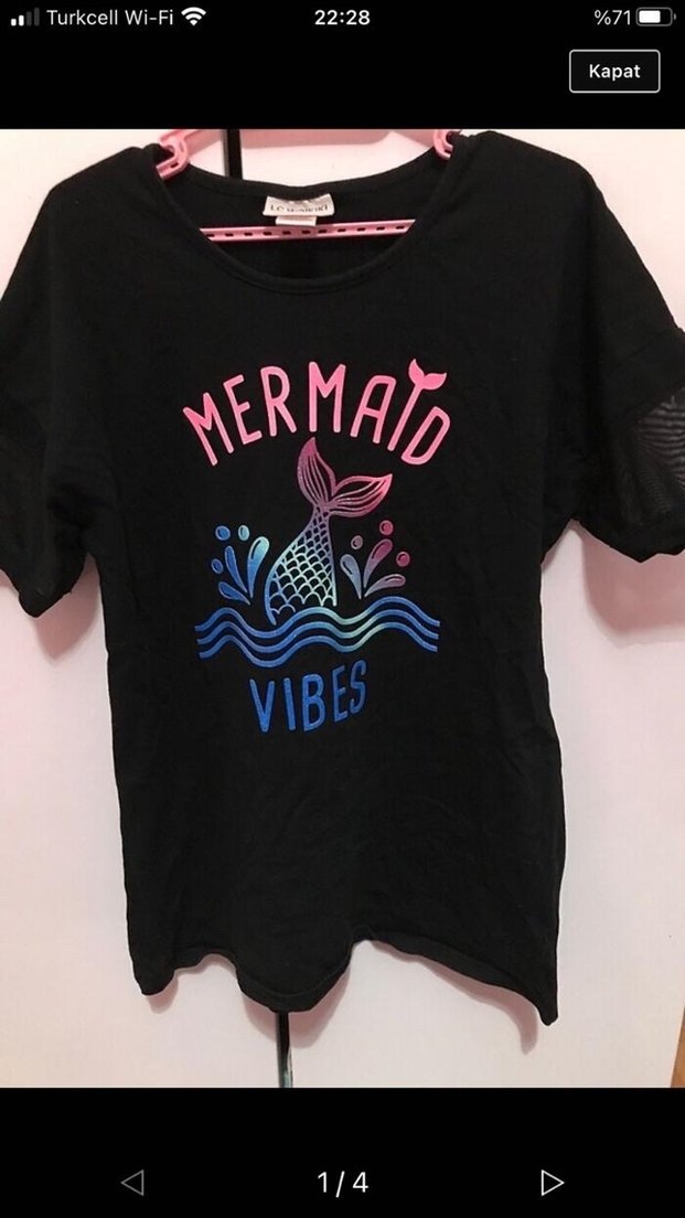 Siyah pamuklu, bol kesim ve V yakalı tişört. Renkli denizkızı baskısı ve 'MERMAID VIBES' yazısı içerir. Kısa kolludur.