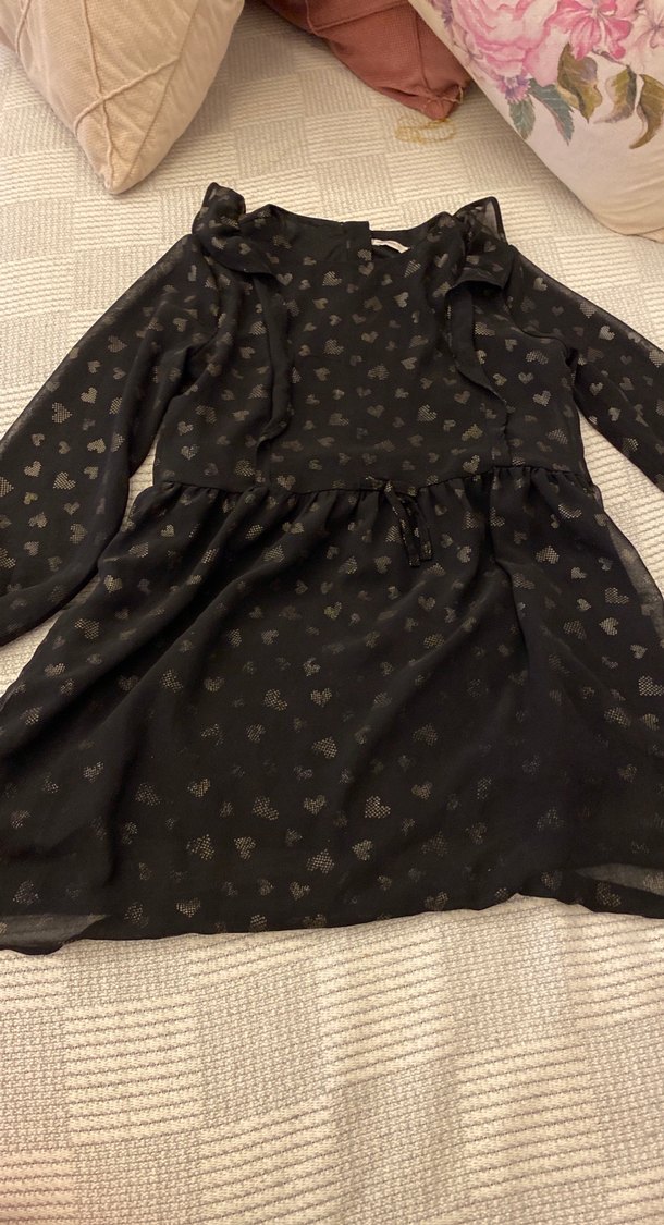 Uzun kollu, V yaka ve fırfır detaylı kız çocuk elbisesi. Sentetik kumaştan, koyu renkli baskılı ve goth tarzında, rahat kesimlidir.