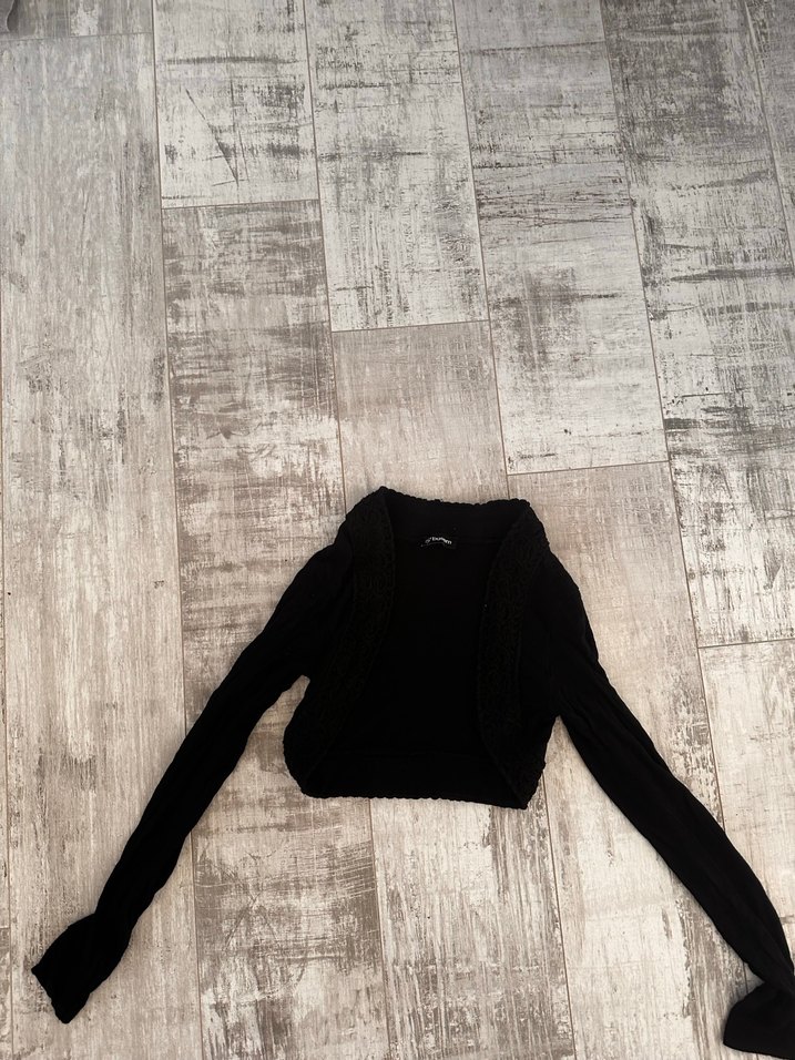 Kız çocuklar için uzun kollu, V yakalı, triko kumaştan siyah bolero. Fitted kesimi ve goth tarzıyla sade ve şık bir parça.