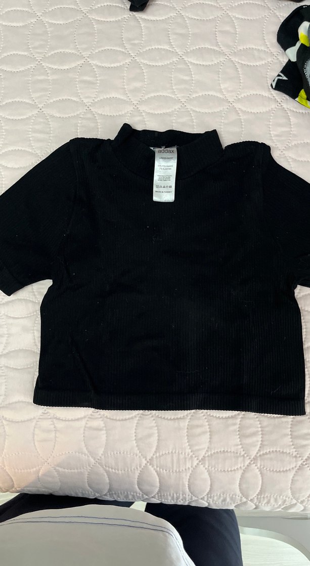 Yumuşak ve sıcak kumaştan, yarım kollu ve yüksek yakalı siyah kız çocuk tişörtü. Düz, sokak stilinde ve şık bir görünüm sunar.