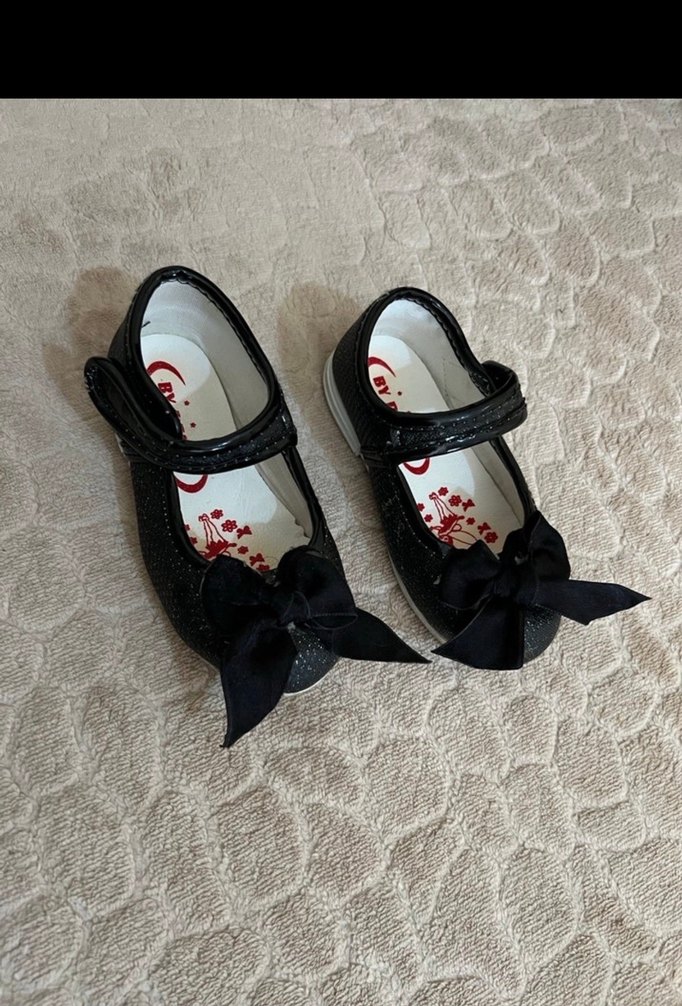 Kız çocukları için siyah yılan derisi desenli, fiyonklu ve kauçuk malzemeden yapılmış gotik tarzda babetler.