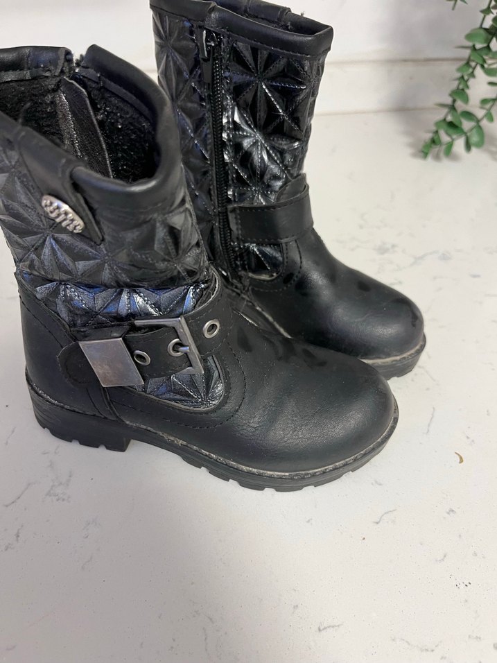 Kız çocuklar için siyah biker bot, tokalı kayışlar ve yılan desenli detaylarla, kauçuk malzemeden yapılmıştır.