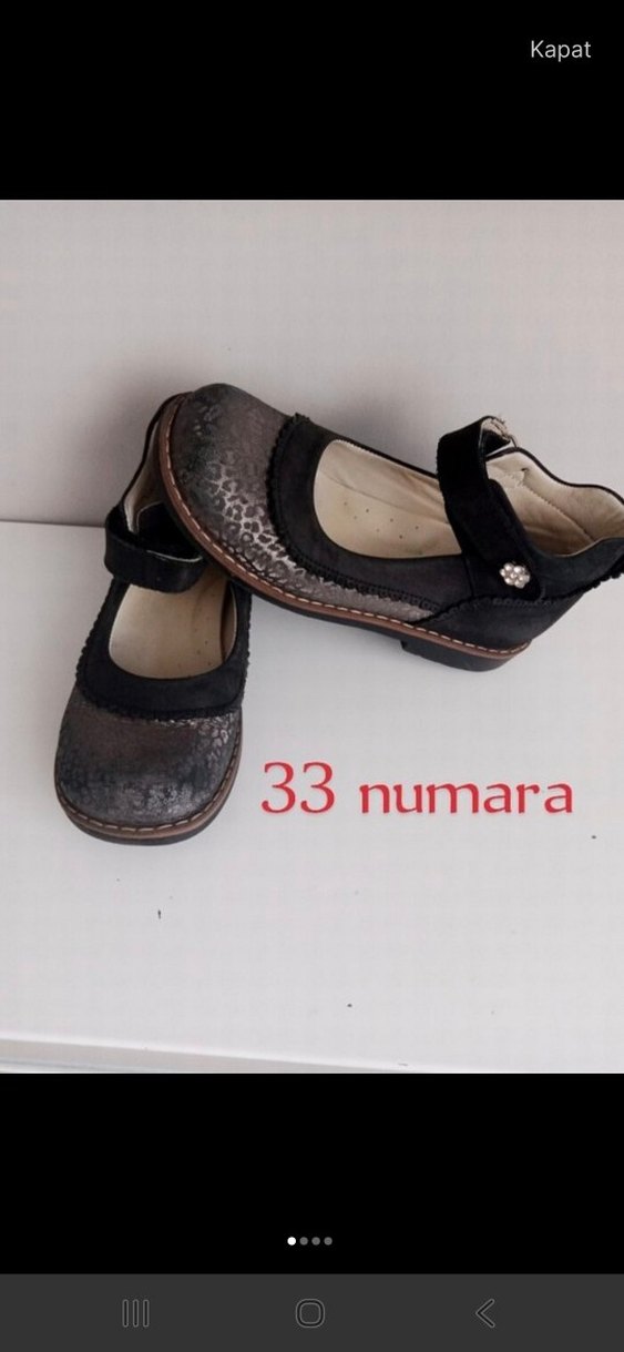 HAKİKİ DERİ. Kız çocukları için siyah ve gri yılan desenli, tokalı bantlı kauçuk babet. 33 numara.