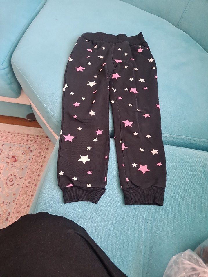 Siyah, pembe ve beyaz yıldız desenli, bol kesim ve elastik bel bantlı kız çocuk eşofmanı. en 25 boy 61 cm tertemiz sorunsuzdur