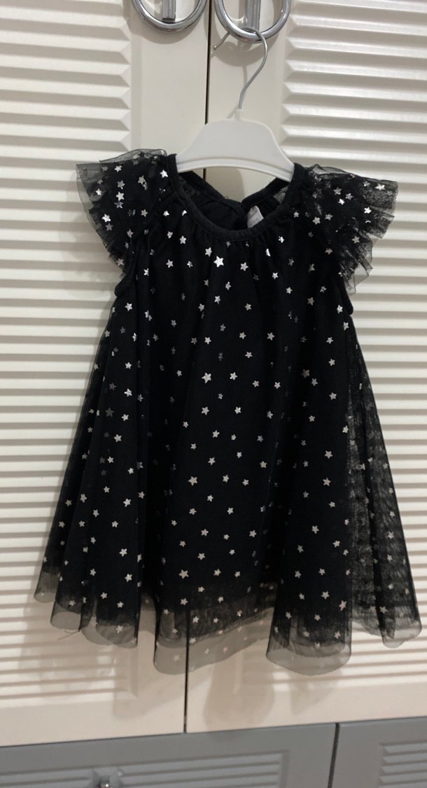 Siyah renkli, yıldız desenli kız bebek,elbise , kısa fırfırlı kollu ve straplez yakalıdır. Sentetik yumuşak kumaştan, loose fit kesimle rahat kullanım sağlar