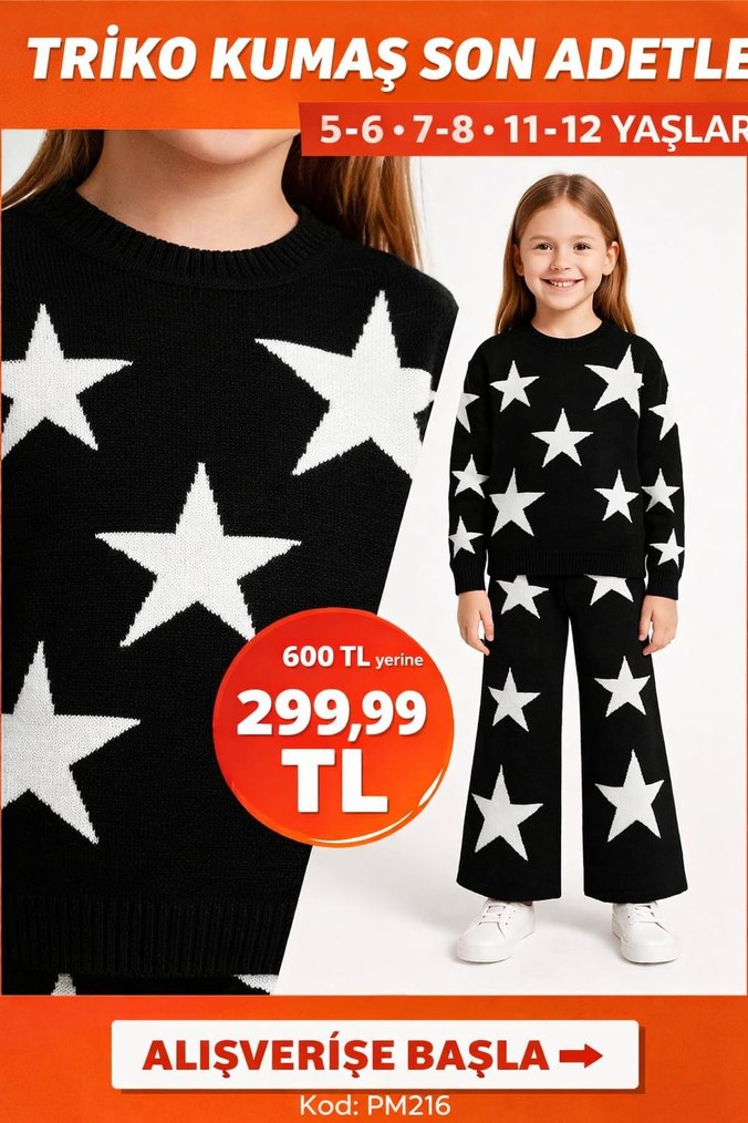Kız çocukları için siyah triko takımı, bol kesim ve beyaz baskılı yıldız desenli. Pamuklu, uzun kollu ve yuvarlak yaka, rahat ve şık sokak stili için uygun. evet çok indirimlerle devam ediyoruz çok çok çok indirim