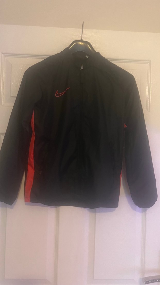 Kız çocuklar için yüksek yakalı, düğmeli, vücuda oturan siyah ceket. Sentetik kumaştan, baskılı detaylı ve kırmızı yan şeritlere sahip. Yağmurluk nıke orijinal