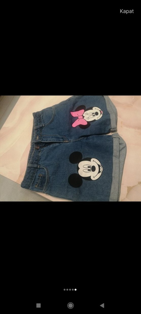 Düğmeli, baskılı Mickey ve Minnie Mouse figürlü, bol kesim koyu mavi kot mini şort, gündelik rahat stil için uygun. defo vs yoktur sıfır gibi çok az giyildi