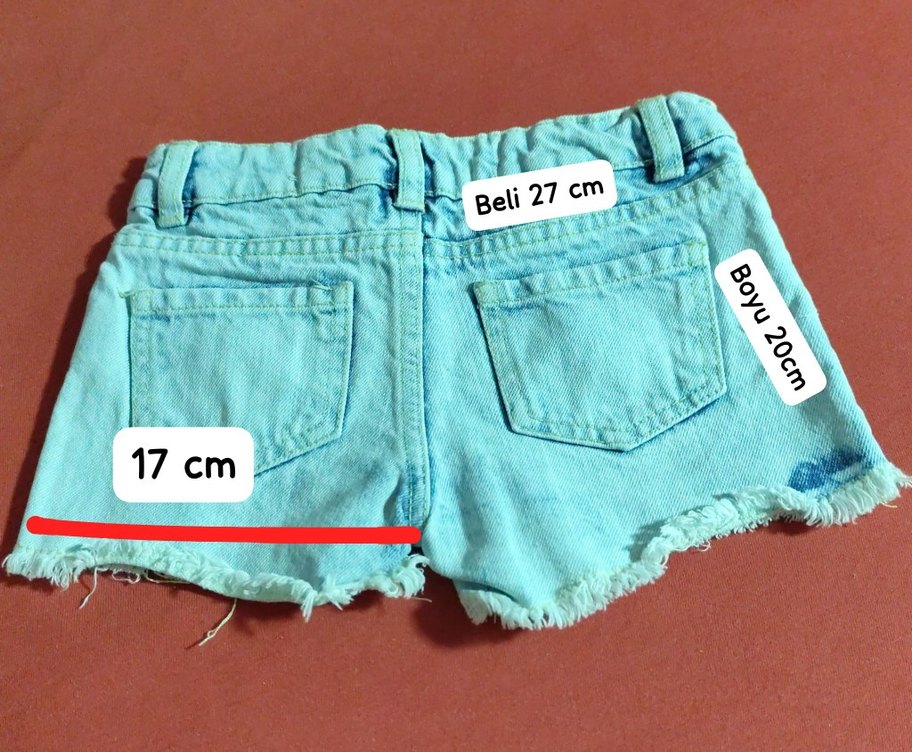 Düğmeli, pastel batik desenli mavi kot şort. Bel ölçüsü 27 cm, dar kesim ve sokak stiline uygun. 3 tane şort