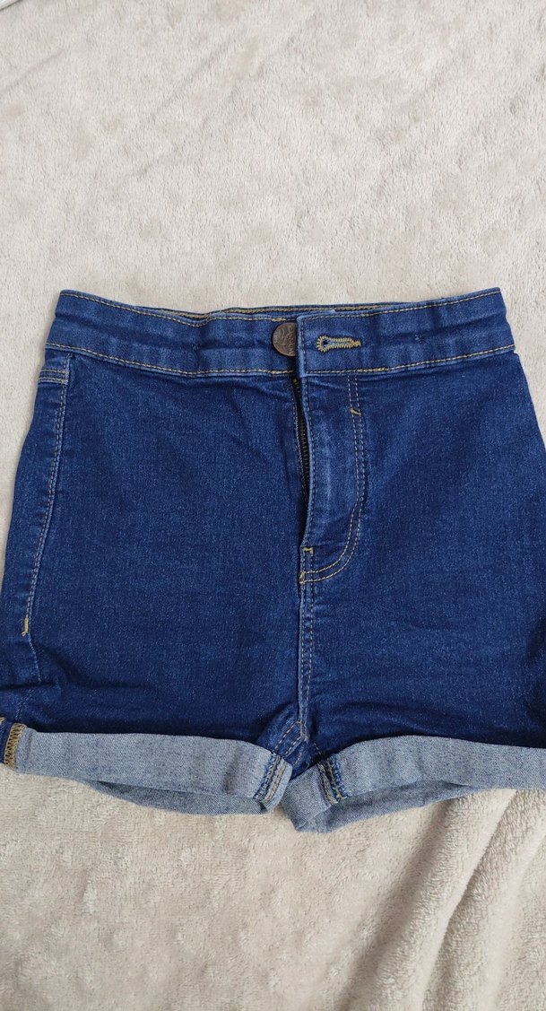 Düğmeli ve katlanmış paçalı, mavi renkli, dar kesim kiz cocuk şort. 7/8 yaş için uygundur 8/9 da kullana bilir