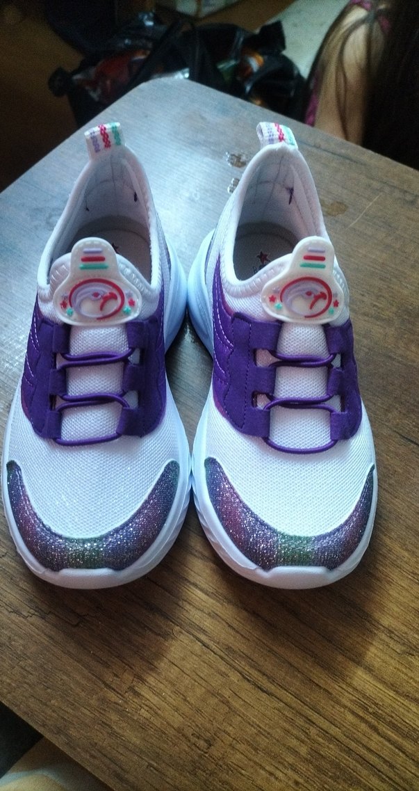 Mor renkli, bağcıksız kız çocuk spor ayakkabısı. Renkli batik desen