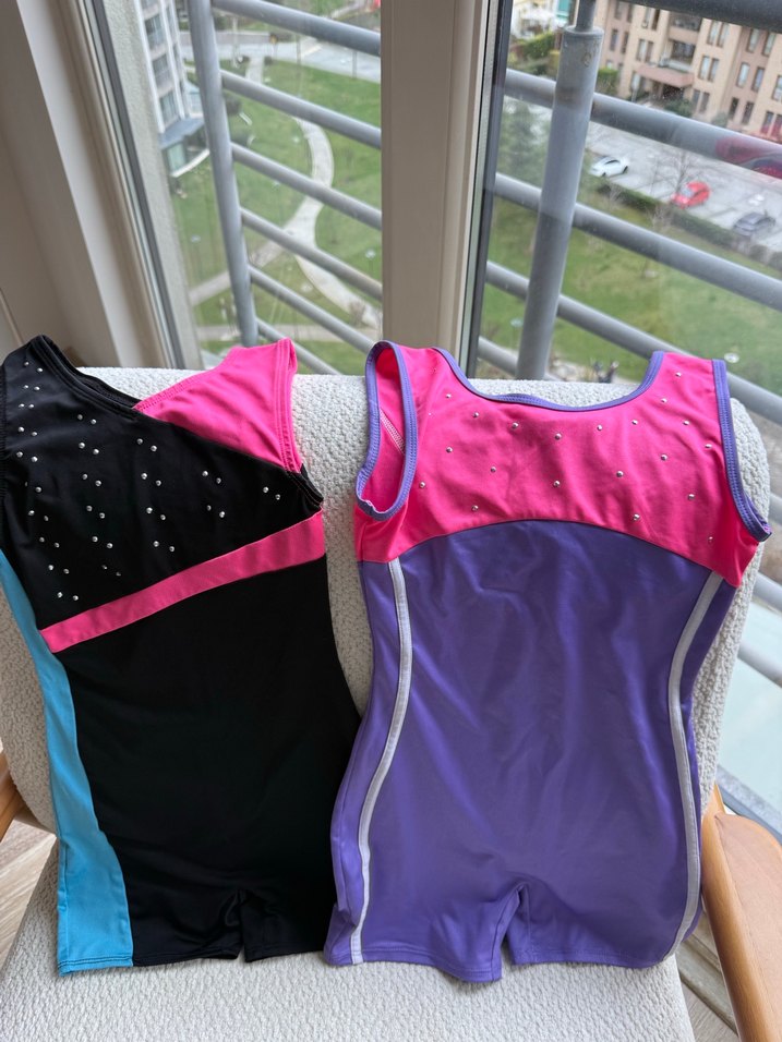 Koyu mor, pembe ve siyah detaylı kız çocukları için kolsuz spor mayo. Amerika’dan alınmıştır. Cimnastik Mayosu