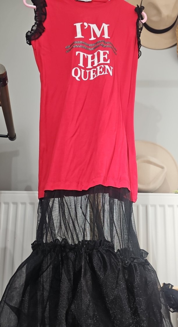 Kız çocuklar için kırmızı straplez, baskılı ve volan detaylı gotik elbise. Siyah tül katmanlı etek ve sentetik kumaştan yapılmıştır.
