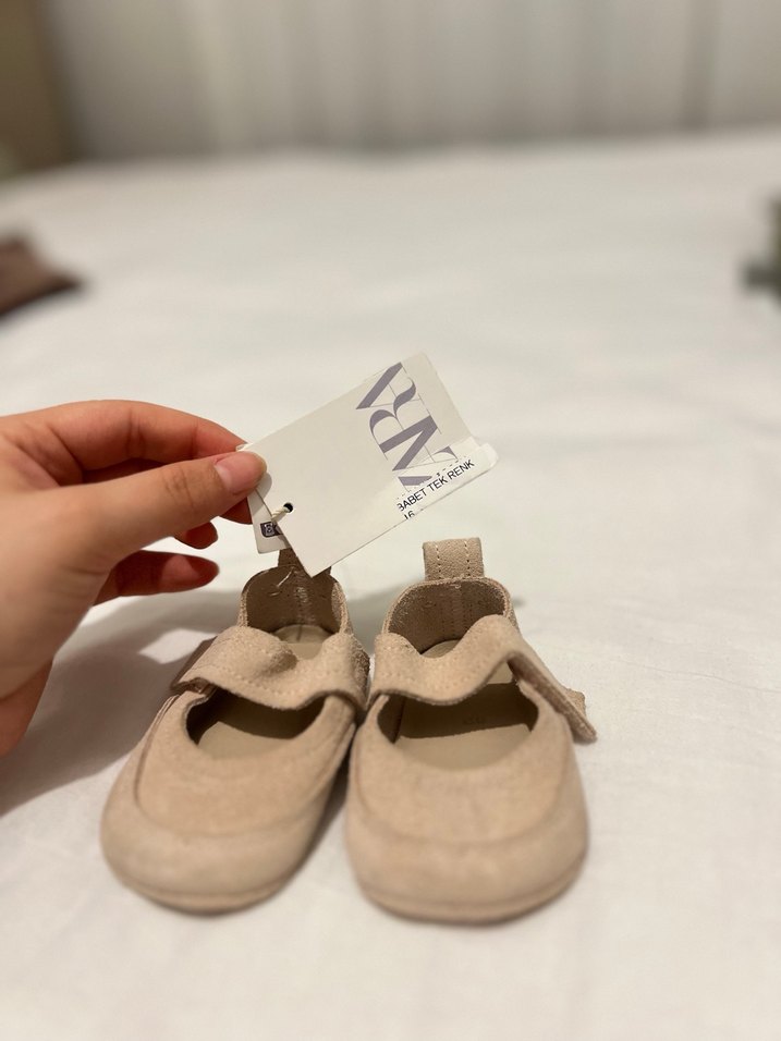 Kız çocukları için bej süet babet ayakkabılar, baskılı desen ve kolay kullanımlı cırt cırtlı bant içerir. Sade, normcore tarzda.
