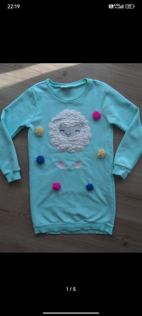 lcw marka, 6-7 yaş. Turkuaz renkli, yumuşak kumaştan kız çocuk sweat elbise. daha sonra tayt uzeri de kullanılır. Nakışlı ve örme koyun figürü, renkli ponpon detaylı. iyi durumdadır.