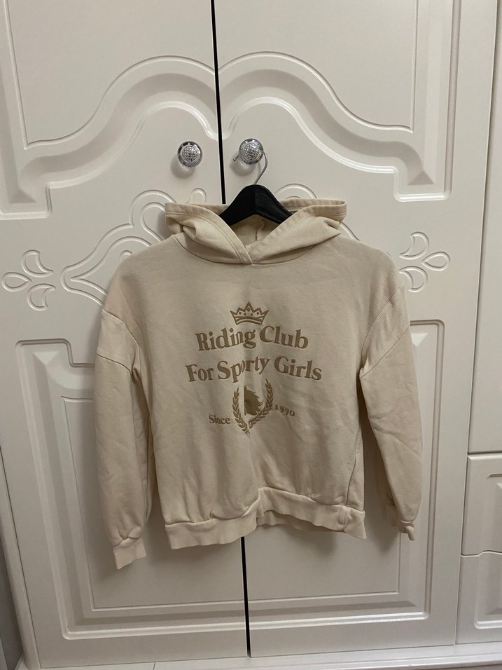 Bej renkte, uzun kollu, bisiklet yaka ve fitted kesime sahip kadın sweatshirt. Yumuşak fleece kumaştan, örgü detaylı ve "Riding Club For Sporty Girls" baskılı. Günlük kullanım için uygun, normal boyda ve pastel tonlarda.