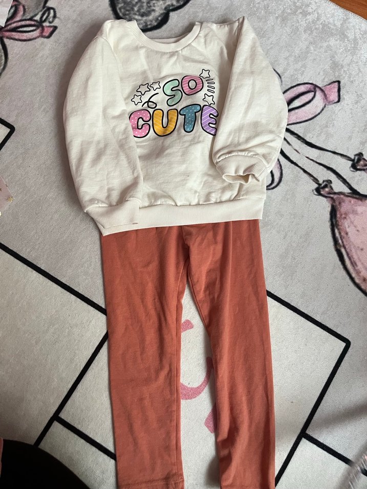 Örme uzun kollu üstünde renkli "SO CUTE" baskısı ve kahverengi pastel tonlarda pantolon bulunan bebek kız takımı. Rahat ve yumuşak kumaş.