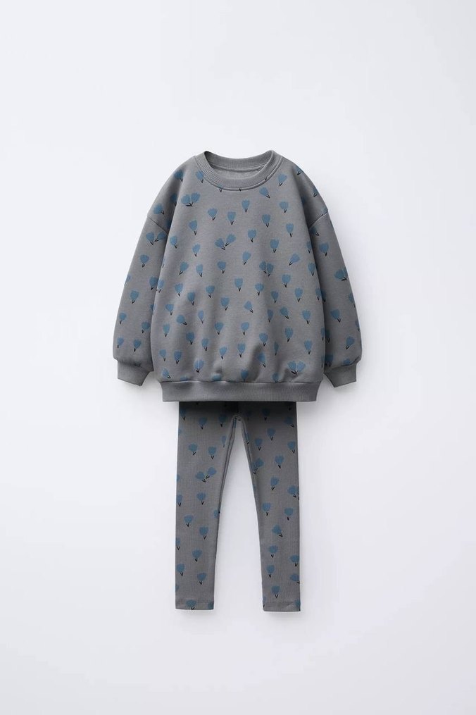 Mavi çiçeklerle süslenmiş gri takım Yumuşacık kumaşıyla gün boyu konfor, her adımda şıklık! #MinikoKids #KızÇocukKombin #ÇocukGiyim