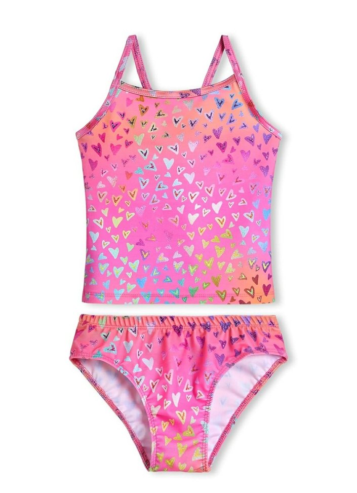 İp askılı, açık pembe kalp desenli kız çocuk bikini takımı. Modern tarzda, plaj için uygundur.