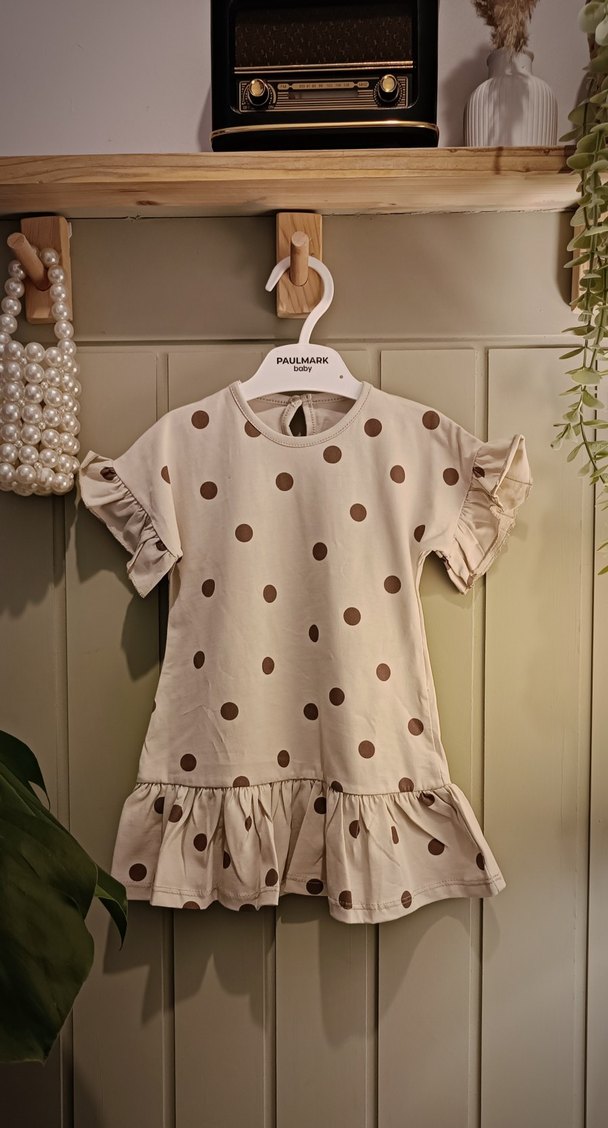 Taş rengi pamuklu kumaştan, kahverengi puantiyeli, kısa fırfırlı kollu ve bol kesim kız çocuk elbisesi. Yuvarlak yaka ve fırfırlı etek ucu ile bohem tarzda.
