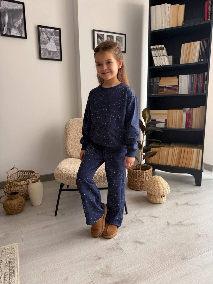Kız çocuk lacivert , bağlama desenli 2 iplik eşofman. Bol kesim, uzun kollu, yuvarlak yakalı ve yumuşak dokulu kumaştan üretilmiştir.
