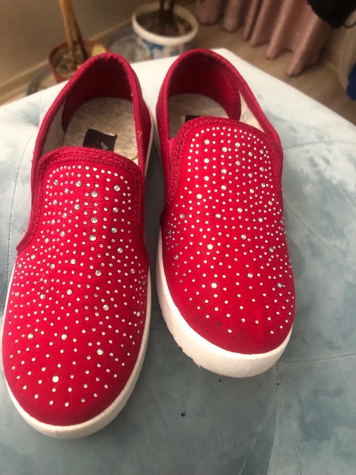 Kırmızı renkte, kız çocuk spor ayakkabısı. Taşlı detaylarla süslenmiş, kauçuk malzemeden yapılmıştır. Minimalist ve renkli tasarım, günlük sokak stiline uygundur. Yeni hiç bir deformasyon yoktur