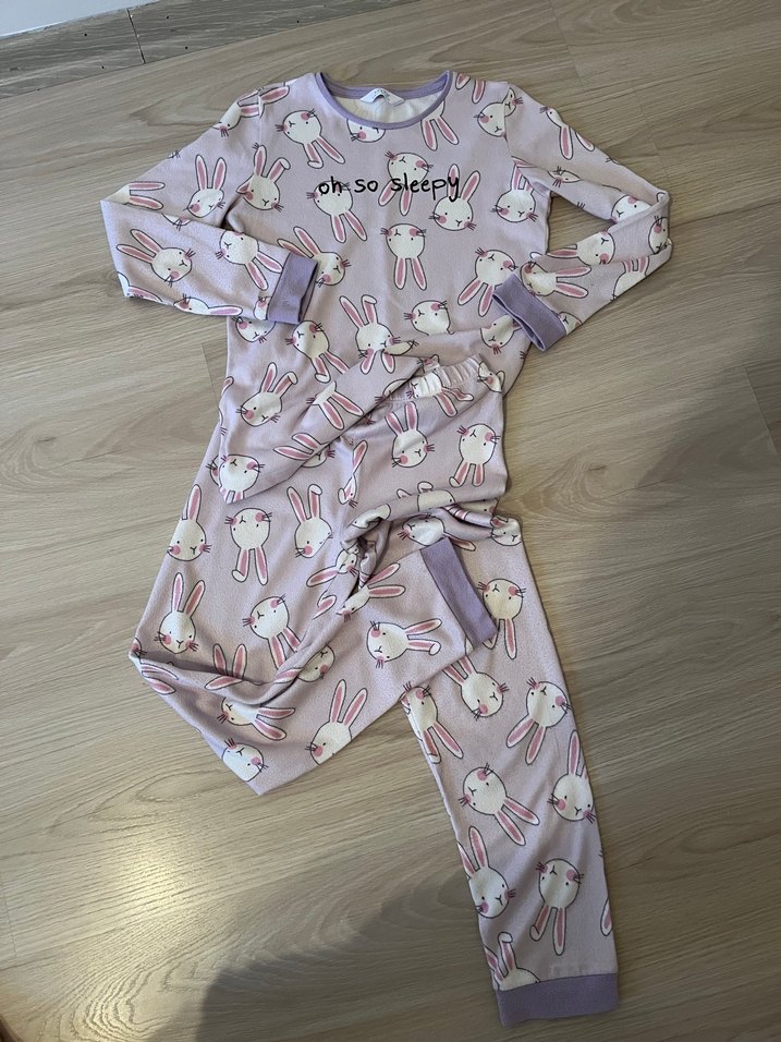 Kız çocukları için uzun kollu, bisiklet yaka, yumuşak termal kumaştan pijama takımı. Pastel lila renkli tavşan deseni ve "oh so sleepy" yazısı içerir.