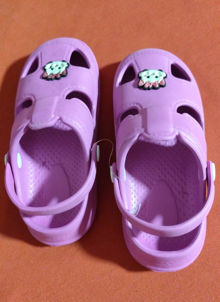 Mor renkte, toka detaylı kauçuk kız çocuk terlikleri. Renkli ve sade tasarımıyla günlük kullanıma uygun.