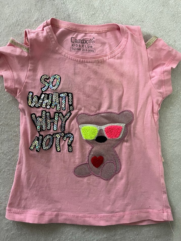 Pamuklu pembe fitted tişört, kısa kollu, yuvarlak yaka. Payetli yazı ve renkli ayı figürü baskılı, trend sokak stili için uygun. #kızcocuktsort #tşört #çocuk