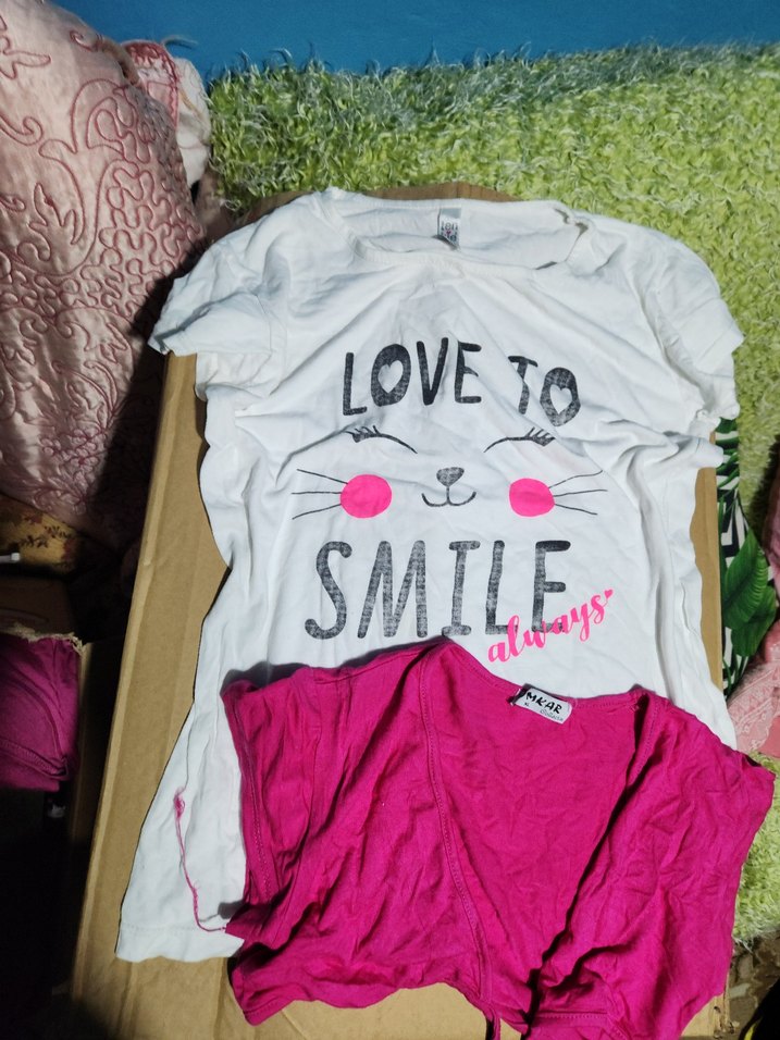 Kız çocukları için dantel detaylı, straplez yakalı ve kısa kollu bol kesim tişört. Renkli sentetik kumaştan, "LOVE TO SMILE always" yazılı baskılı desenli.