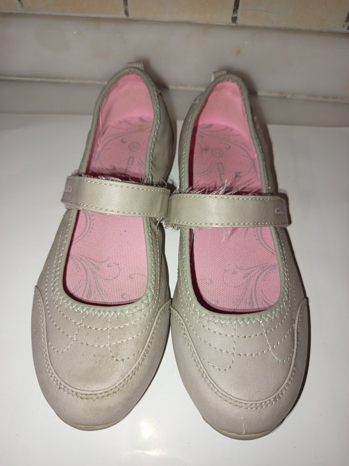 Kız çocukları için bej tokalı babet ayakkabı, 34 numara, yumuşak kauçuk hissi veren malzemeden üretilmiştir. İç kısmı pembe ve hafif desenlidir.