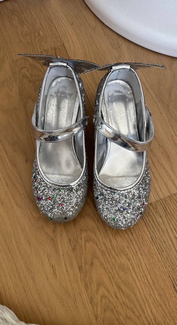 Gri simli metal yüzeyli kız çocuk babetleri, çok renkli ışıltılı ve çağdaş tarzdadır. Kayışlı ve şık tasarıma sahiptir. ✨