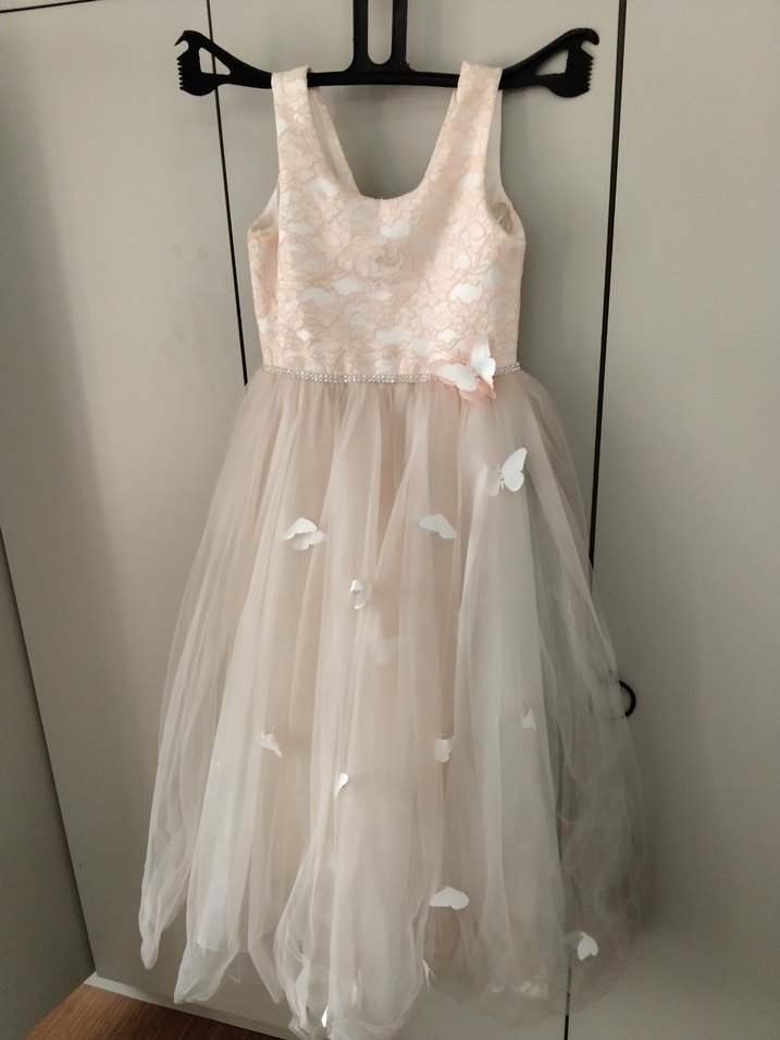 Dantelli üst kısmı ve kelebek süslemeli tül etekli toz pembe renk, kolsuz ve pelerinli çocuk elbisesi.