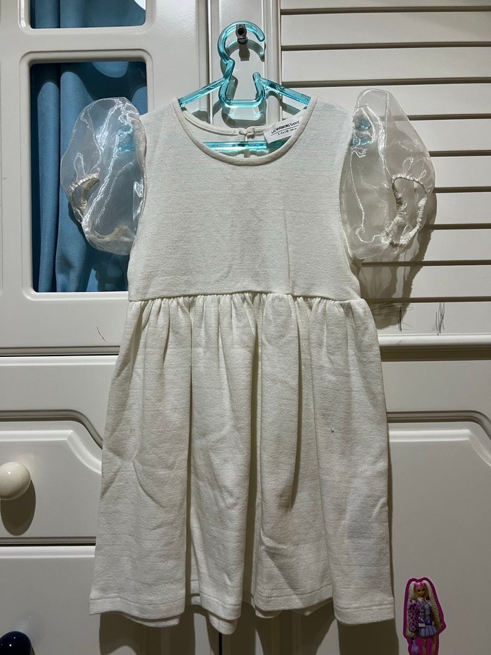 Kız çocuk keten kumaştan, transparan kabarık kısa kollu, yuvarlak yaka, bol kesim beyaz elbise. Pastel tonlarda, desensiz ve şık sokak stili.