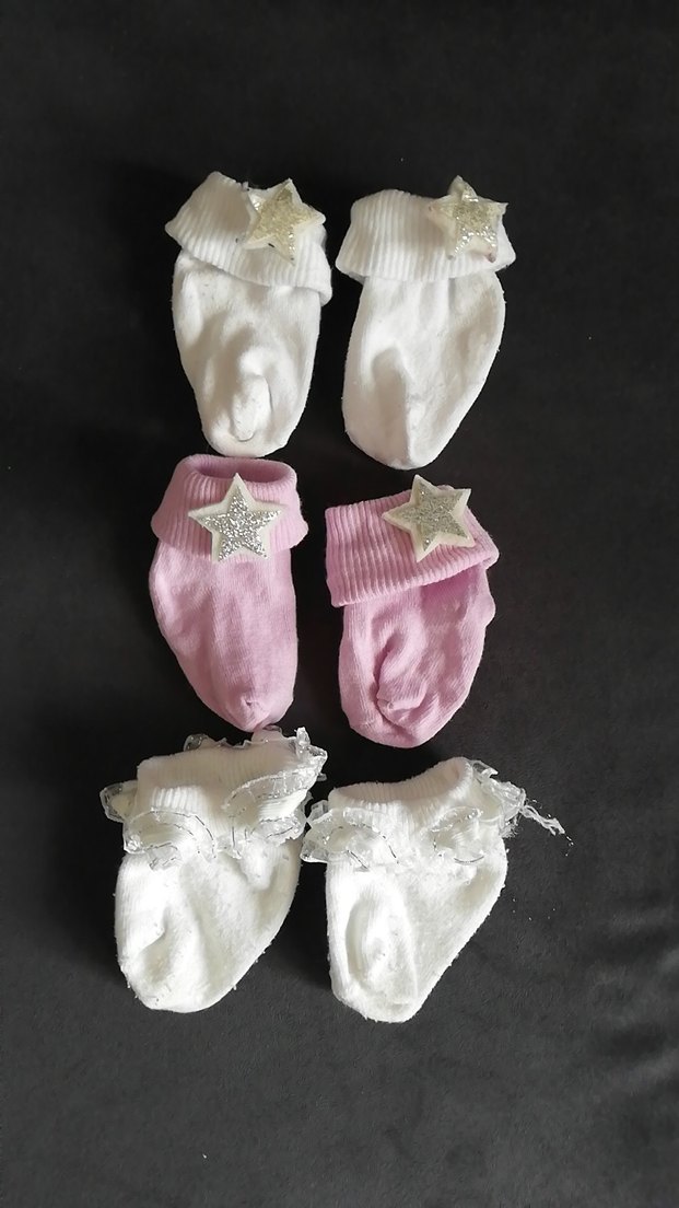Yıldız süslemeli ve ince dantel detaylı, beyaz ve pembe tonlarında kız çocuk triko çorap seti. Bebek ürünlerinden alana hediye vereceğim