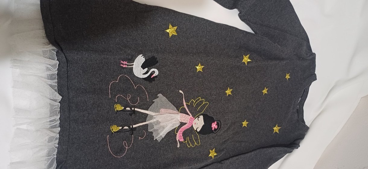 Gri renkte, yumuşak kumaştan, nakışlı, etek ucu tüllü Çok az ve temiz kullanıldı , herhangi bir kusuru yok 9 yaş ve üzeri kullanabilir