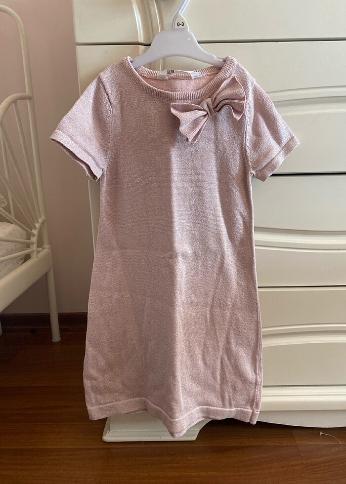 H&M marka 5-6 yaş kısa kollu triko elbise. Simli ip dokuma içi yumuşak çocuğu rahatsız etmiyor , simler dökülme yapmıyor. İki kızıma da severek giydirdim, hiç bir deformesi yoktur.