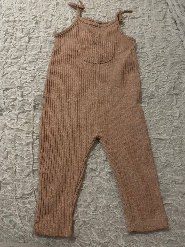 Kız çocukları için kahverengi triko tulum, rahat kesim ve askılı, yumuşak triko kumaştan, desensiz sade tasarıma sahiptir.