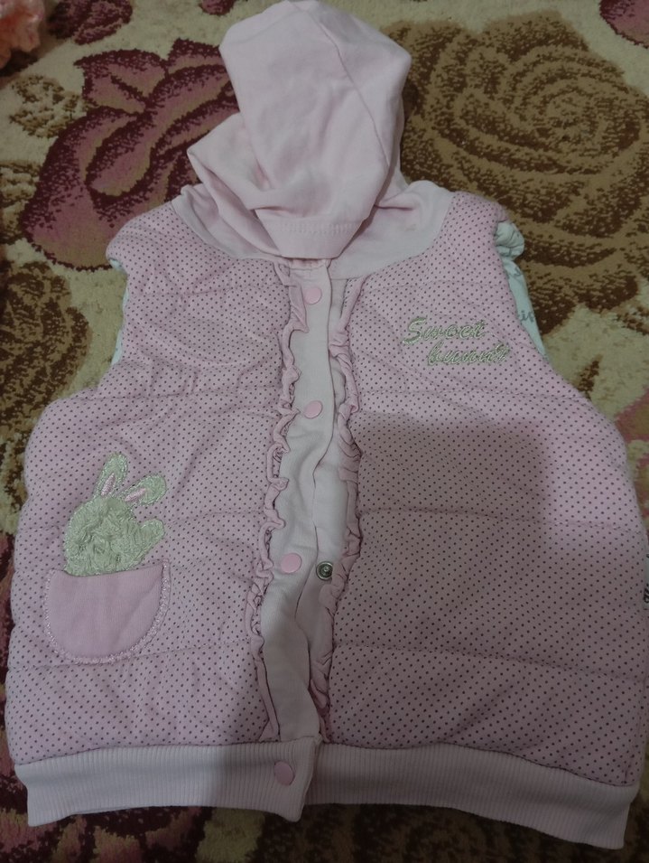 Pembe triko, kapüşonlu ve kolsuz kız yeleği, işlemeli detaylar ve straplez yaka ile sokak modasına uygun. Ön düğmeli, yumuşak ve sıcak dokuda.