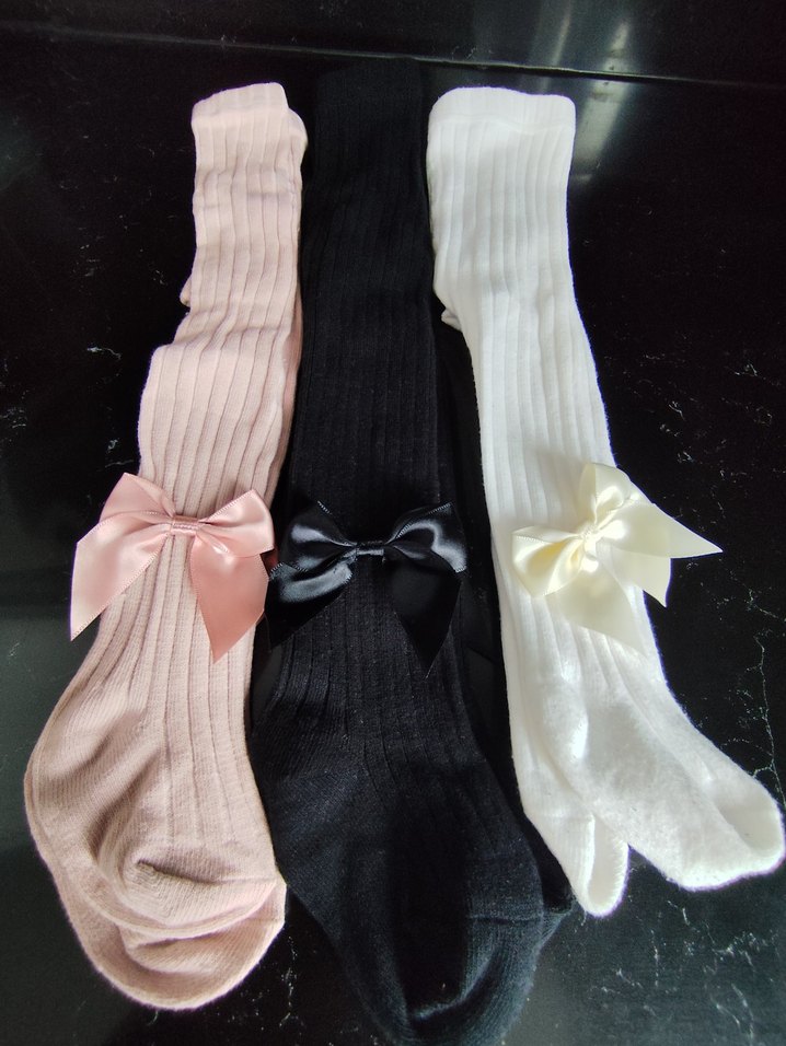 Pastel pembe, siyah ve beyaz renklerde, küçük fiyonk detaylı triko kız çocuk külotlu çorap seti. Yumuşak ve desensizdir. isterseniz teklide alabilirsiniz