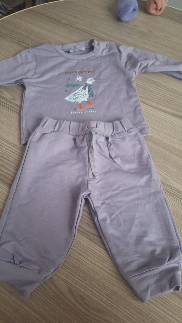 Uzun kollu, bisiklet yaka, baskılı sweatshirt ve bol kesim, triko kumaştan sweatpants seti.