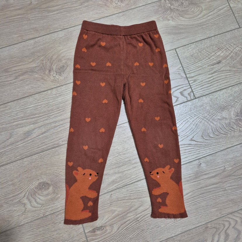 Kahverengi triko kalın kız çocuk taytı, bol kesim ve kalp desenli. Ayak bileğinde sevimli hayvan figürleri bulunur. Yumuşak ve sıcak kumaştan üretilmiştir.