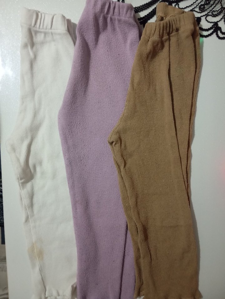 Bu set, bej, lila ve beyaz pastel tonlarda, triko dokulu kız çocukları için üç adet dar kesim tayt içerir. Yumuşak sentetik kumaştan üretilmiş, sade ve temel bir tarza sahiptir. giyilir durumda hafif tüylenme mevcut birde beyaz olan da lekeler var çıkar mı bilemiyorum uyguna koyuyorum